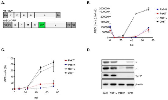 ABLV, like all lyssaviruses, has a 3’-5’(-)ssRNA genome that encodes five proteins: nucleoprotein (N), phosphoprotein (P), matrix protein (M), envelope glycoprotein (G), and large RNA polymerase (L). We used reverse genetic techniques to generate a recombinant ABLV reporter virus expressing a green fluorescent protein (rABLV-GFP) (Figure 1A). The ABLV anti-genome plasmid was modified with the insertion of a GFP open reading frame between the G and L genes. First, we compared ABLV replication in black flying fox and human cell lines. To conduct these experiments, we utilized brain (PaBrH) and kidney (PaKiT) tissue-derived black flying fox cell lines [44]. The PaBrH cell line is morphologically fibroblast-like in appearance so we chose to compare ABLV replication with a human neuroblastoma cell line (NBF-L) that also had fibroblast-like morphology [54]. A human embryonic kidney cell line, that was similarly immortalized with a SV40 T antigen (HEK293T), was included for comparative purposes with the PaKiT cell line.
