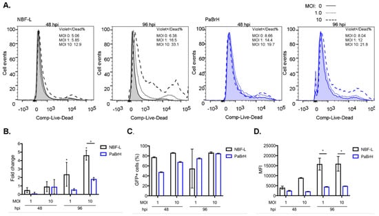 ABLV infection induces less cell death in black flying fox cells. (A) Histogram overlays LIVE/DEAD Violet stained NBF-L and PaBrH cells after rABLV-GFP infection. Percentages of Violet+ dead cells are demarcated for hpi and MOI indicated. (B) Percentage of dead cells expressed as a fold change compared to MOI 0 at each time point. Data are a representative of three independent experiments, * p < 0.05, ANOVA (two-way), and Tukey’s multiple comparison test. (C) Percentage of GFP positive cells at 48 and 96 hpi. (D) Median fluorescence intensity (MFI) of ABLV expressed GFP. Data (C–D) are representative of two independent experiments, mean ± SEM, * p < 0.01, ANOVA (two-way), and Tukey’s multiple comparison test.