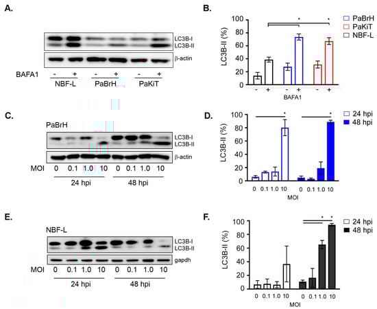 ABLV infection activates autophagy. (A) LC3B western blot of lysates from human NBF-L and black flying fox PaBrH and PaKiT cells, treated with BAFA1 (400 nM; 2 h). (B) LC3B-II (β-actin-normalized) from BAFA1 treated cells. (C) LC3B western blot of lysates from PaBrH cell lysates. PaBrH cells were infected for times (hpi) and MOI indicated. (D) LC3B-II (β-actin-normalized) expressed as a percentage of total LC3B from PaBrH cells infected with rABLV-GFP. (E) LC3B western blot of lysates from NBF-L cells infected with rABLV-GFP. (F) LC3B-II (gapdh-normalized) from NBF-L cells infected with rABLV-GFP. PaBrH and NBF-L cells were infected with rABLV-GFP for times (hpi) and MOI indicated. All data are a representative of three independent experiments, LC3B-II is expressed as a percentage of total LC3B, mean ± SEM, * p < 0.05, student’s t-test.