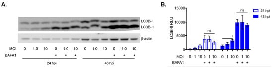 ABLV infection and autophagy activation in primary black flying fox brain cells. (A) Western blot for LC3B in primary black flying fox brain (PaBr) cells following 24 and 48 hpi with wt-ABLV MOI indicated. BAFA1 treatment (400 nM) was used as a control for blocking autophagic flux. (B) Quantification of LC3B-II levels (β-actin normalized) relative light units (RLU) from cells infected in (A). All data are representative of three independent experiments, mean ± SEM and * p < 0.05 ANOVA (two-way), and Tukey’s multiple comparison test (48 hpi MOI 0 vs. MOI 10).