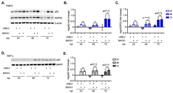 To further characterize the increase in LC3B-II after ABLV incubation, we monitored cytosolic levels of autophagy cargo receptor proteins, p62 and NDP52, which are associated with selective autophagy and used to monitor autophagic flux [61,62,63,64]. Virus proteins, such as HIV Nef protein and influenza M2, inhibit autophagic flux by blocking fusion of autophagosomes with autolysosomes [65,66]. Inhibition of autophagic flux and the resulting accumulation of autophagosomes and their contents such as LC3B-II could be misinterpreted as virus activation of autophagy. If autophagic flux is unobstructed by ABLV infection, p62 and NDP52 will be degraded, whereas inhibition of autophagic flux will lead to an increase in these cargo proteins. We examined levels of p62 and NDP52 in PaBrH cells after ABLV infection, and in combination with BAFA1 treatment. Infection with ABLV alone resulted in less p62 (Figure 5A,B) and NDP52 (Figure 5A,C) detected in PaBrH cells at 48 hpi. In NBF-L cells, a mean fold decrease in p62 was observed at both 48 and 72 hpi (Figure 5D,E). Treatment with BAFA1 alone or in combination with ABLV infection at all time points resulted in a significant increase of p62 and NDP52 in PaBrH cells (Figure 5A–C) and NBF-L cell (Figure 5D,E), however p62 and NDP52 fold-changes between ABLV alone and ABLV plus BAFA1 were insignificant. Since additive effects of BAFA1 inhibition of autophagic flux were not observed during ABLV infection and we observed a fold decrease of p62 and NDP52 48 hpi, we concluded that ABLV alone was not inhibiting autophagic flux. Together, increased LC3B-II (Figure 3 and Figure 4) and decreased p62/NDP52 protein levels (Figure 5) in black flying fox cells further demonstrated that ABLV infection induced the autophagy pathway.