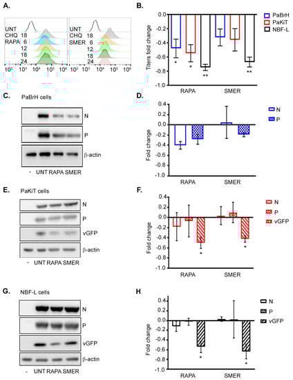 Pharmacologic activation of autophagy limits ABLV replication. (A) Flow cytometry histogram overlays of PaKiT cells stained with CYTO-ID®. PaKiT cells were treated with RAPA (2 µM), and SMER (50 µM) for h indicated; as well as CHQ (1 µM, 18 h). (B) Fold change in rABLV-GFP titers (pfu/mL) fold change from PaBrH, PaKiT, and NBF-L cell culture supernatants collected 48 hpi (MOI 1.0). Cells were treated with RAPA (2 µM) and SMER (50 µM) for 24 h. (C) Western blot of ABLV N, P, and vGFP in PaBrH cell lysates. (D) Fold change in ABLV N, P, and vGFP proteins (β-actin-normalized) from PaBrH cell lysates. (E) Western blot of ABLV N, P, and vGFP collected in PaKiT cell lysates. (F) Fold change in ABLV N, P, and vGFP proteins (β-actin-normalized) collected from PaKiT cell lysates. (G) Western blot of ABLV N, P, and vGFP collected in NBF-L cell lysates. (H) Fold change in ABLV N, P, and vGFP proteins (β-actin-normalized) collected from NBF-L cell lysates. (C–H) Whole cell lysates were collected 48 hpi (rABLV-GFP MOI 1.0). Fold change is a representation of at least three independent experiments, mean ± SEM and ** p < 0.001, * p < 0.05 ANOVA (one-way) analysis, Dunnett’s multiple comparison test with treatments compared to DMSO mock treated cells.