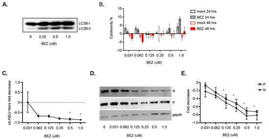 BEZ treatment reduced wt-ABLV replication in a human neuroblastoma cell line. (A) Western blot of LC3B protein in lysates from NBF-L cells were treated with indicated concentrations of BEZ for 4 h. (B) Lactate dehydrogenase cytotoxicity assay of NBF-L cells treated with BEZ or mock-treated with DMSO. ANOVA analysis revealed no significant differences of quantified spontaneous cytotoxicity between DMSO or BEZ treatments. (C) Fold decreases in wt-ABLV titers (pfu/mL) from cells treated in (A) fold decreases. (D) Western blot image of wt-ABLV N and P protein in NBF-L lysates prepared in (A). (E) Fold decreases in wt-ABLV N and P protein from cells treated in (A). Data are a representative of three independent experiments, mean ± SEM, * p < 0.05 ANOVA (one-way) analysis BEZ (µM) compared to DMSO (mock) treatment.
