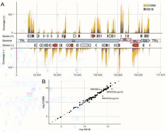 The overall RNA-seq dataset consisted of 82.6 million reads from three biological replicates of CVI988 (48.2 million reads) and two biological replicates of RB1B (34.4 million reads). A third replicate of RB1B did not yield sufficient amount of reads and was therefore excluded from our analysis. An average of 10.5% and 11.2% of the CVI and RB1B datasets respectively could be mapped to the MDV reference sequence (see Table S3).