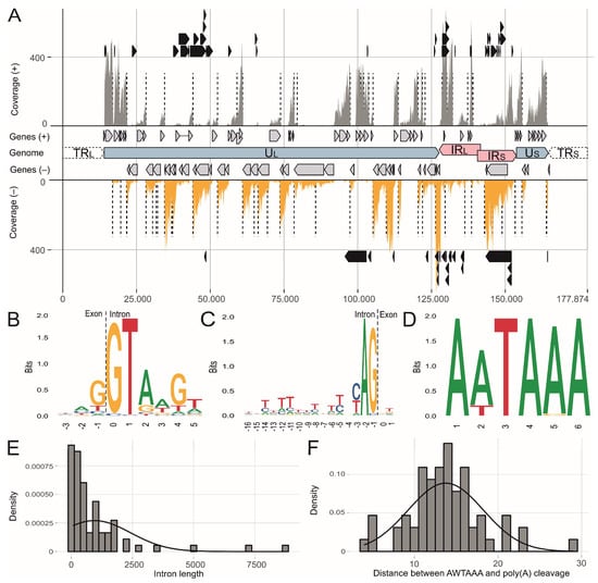 Overview of Marek’s disease virus (MDV) mRNA splicing and poly(A) cleavage. (A) Visualization of the cumulative CVI988 and RB1B RNA-seq coverage of plus (+) and minus (-) strand-encoded genes across the MDV genome. Black arrow bars indicate introns and dashed lines indicate poly(A) cleavage sites. More detailed information is shown in Table S4 and Table S5. (B) Nucleotide frequency maps (sequence logo) of splice donor sites in MDV-encoded mRNAs. The relative heights of letters correspond to frequencies of bases at each position. (C) Sequence logo of splice acceptor sites in MDV-encoded mRNAs. (D) Sequence logo of polyadenylation signals in MDV-encoded three prime untranslated regions (3′-UTR). (E) Histogram depicting MDV intron length distributions. (F) Histogram depicting the distance from AWTAAA-like motifs to the poly(A) cleavage site.