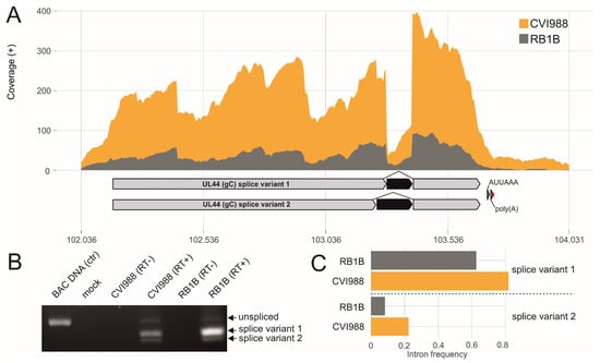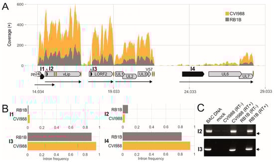 The MDV unique regions mainly harbor genes that are conserved among alphaherpesviruses and are involved in DNA replication and production of progeny virus []. The UL spans over roughly 113,000 base pairs and harbors the majority of the MDV-encoded genes []. Within the UL, we could detect high transcription rates of nearly all annotated genes. Splicing was identified in multiple genes including RLORF14 (pp24), vLIP [], and LORF2 (MDV012) [] and in a transcript antisense to UL5 (MDV017) (Figure 3). Only minor differences were observed in the intron frequencies between RB1B and CVI988. To confirm the splice events and frequencies detected by RNA-seq, we performed RT-PCR analyses on several randomly selected genes (Figure 3C, Figure 4B, Figure 5C, Figures S2 and S3). All analyzed genes showed a comparable splice pattern in both RNA-seq and RT-PCR. In addition, we confirmed a novel splice site of UL15 by MS and RT-PCR (Figure S2). UL15 encodes the tripartite terminase subunit that is involved in DNA packaging into the viral capsid. Splicing of UL15 mRNA has already been observed in herpes simplex virus type 1 (HSV-1) [] and duck enteritis virus (DEV) []. However, the observed UL15 isoforms in MDV are to our knowledge unknown and expand the number of potential proteins encoded by UL15 to at least five.