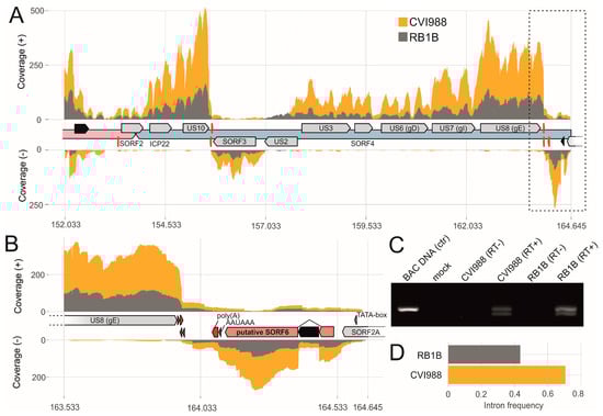 The Marek’s disease virus (MDV) unique short (US) region. (A) Visualization of RNA-seq coverage across the MDV US region with respective introns in black. (B) Zoom into the far-right region of the MDV US with depiction of the novel US gene SORF6. Green and red arrows indicate the polyadenylation signals and the poly(A) cleavage sites, respectively. (C) RT-PCR was performed to validate the splicing event in the novel gene SORF6. PCR products were derived using forward/reverse primers to amplify the respective intron-flanking regions as full-length (upper band) and spliced (lower band). (D) Comparison of the novel US gene (SORF6) intron frequencies in RB1B and CVI988 infected primary chicken B cells.