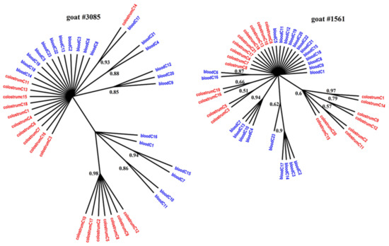 - Pisoni, G.; Moroni, P.; Turin, L.; Bertoni, G. Compartmentalization of small ruminant lentivirus between blood and colostrum in infected goats. Virology 2007, 369, 119–130. [Google Scholar] [CrossRef]