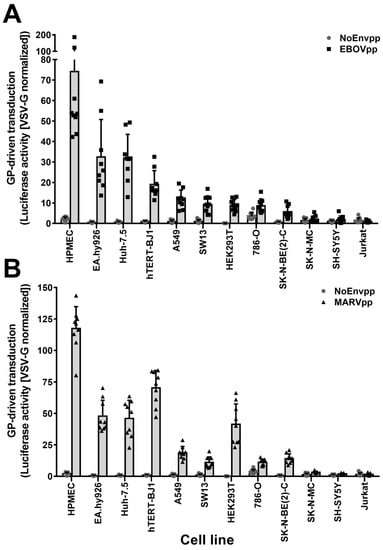 Unbiased cell screening for susceptibility to EBOV (EBOVpp) and MARV (MARVpp) GP-driven transduction. A panel of twelve cell lines were transduced with EBOV (A) or MARV (B) firefly luciferase pseudoparticles. Pseudoparticles with no envelope proteins (NoEnvpp) or VSV-G (VSV-Gpp) were used as negative and positive control, respectively. Seventy-two hours post transduction, cells were lysed and luciferase activity was measured. Data were normalized to VSV-Gpp activity as indicated in material and methods. Graphs plot the mean values of three independent experiments performed in triplicate (n = 9) with error bars representing the standard deviation (SD). Individual values are represented as dots, squares or triangles.
