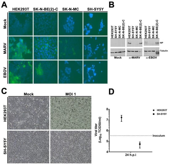 SH-SY5Y is resistant to EBOV and VSVΔG-EBOVGP infection. (A,B) Authentic filovirus infection. Susceptible HEK293T, SK-N-BE(2)-C as well as resistant SK-N-MC and SH-SY5Y cells were infected with EBOV or MARV or mock-infected for 1 h at a MOI of 0.1. Seventy-two hpi, cells were fixed and stained for EBOV and MARV NP (A) using DAPI as counterstaining. Images acquired with a 40× objective (B) In parallel, remaining cells were lysed, and analyzed by immune-blotting for virus NP. α-tubulin was used as internal control. Images and blots are representative of three independent infections. (C,D) rVSVΔG-EBOV infection. HEK293T and SH-SY5Y cells were infected with rVSV bearing EBOV Mayinga GP for 1 h at 37 ºC. Fresh media was added and cells further incubated for 48 h. A 10× objective was used for image acquisition (C) 48 hpi. GP-specific cell rounding and detachment. (D) Cell supernatant was collected 24 hpi and viral titers determined by TCID50.