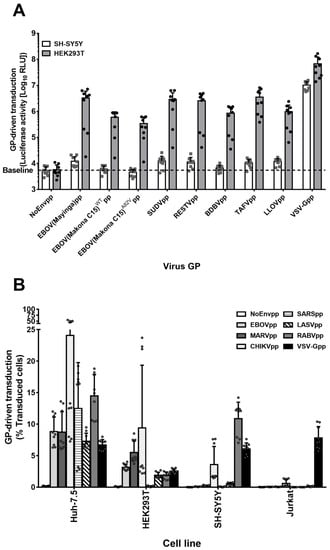 SH-SY5Y cells are resistant to pseudoparticles bearing either Ebolavirus species GPs but susceptible to pseudoparticles bearing glycoproteins of other virus families. (A) SH-SY5Y cell susceptibility to Ebolavirus species and entry-enhancing variant GPs. HEK293T and SH-SY5Y cells were transduced for 6 h with denoted pseudoparticles encoding for a firefly luciferase reporter gene. After 72 h, 100 µL of cell lysates were measured for luciferase activity. Unspecific entry was determined by NoEnvpp RLU values. Data are the log10 RLU mean values of 3 independent transductions with 9 individual values. Error bars represent SD. (B) Cell–virus specificity analysis. Huh-7.5, HEK293T, SH-SY5Y, and Jurkat cells were transduced with GFP-encoding lentiviral particles pseudotyped with different GPs or No GP (NoEnvpp) for 6 h at a MOI of 0.1 (titers determined in Huh-7.5). Seventy-two hours later, cells were analyzed for GFP expression by flow cytometry. The graph is the representation of the mean percentage of transduced cells plus individual values of the three independent experiments ± SD.