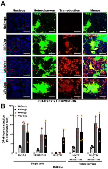 SH-SY5Y cells do not express a dominant entry restriction factor. Huh-7.5 or SH-SY5Y cells stably expressing the tetracycline-inducible Tet On 3G transactivator protein were cocultured with HEK293T-H6 cells stably expressing transactivator-inducible ZsGreen1 green fluorescent protein for 24 h. Cells were chemically fused with PEG. One hour after fusion, cells were transduced with NoEnv, EBOV, MARV, or VSV-G pseudoparticles encoding mCherry for 6 h at 37 °C. Seventy-two hours post transduction, cells were fixed with 3% PFA and analyzed for heterokaryon formation (ZsGreen1 protein expression) and susceptibility to pseudoparticle infection (mCherry protein expression). (A) Confocal microscopy images of one representative experiment with SH-SY5Y and HEK293T-H6 cells. Scale bars = 50 µm (B) Quantification of transduced cells by flow cytometry. Left-hand side of graph represents transduction percentage of single cell line controls and right-hand side from heterokaryons (discriminated previously by gating on ZsGreen1 positive cells). Mean ± SD. of three independent cell fusions and subsequent transduction experiments (n = 3).