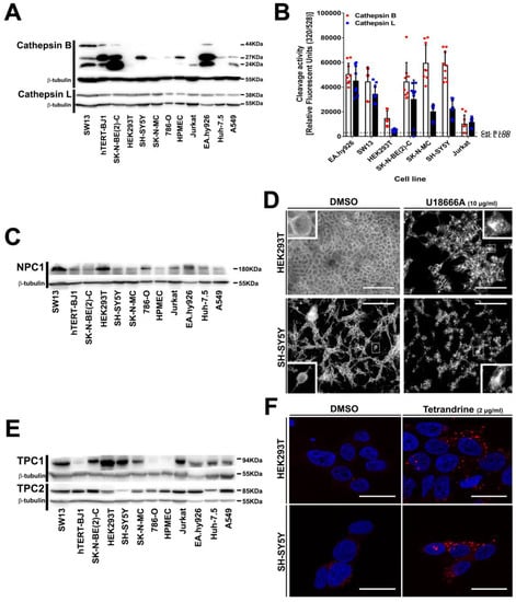 NPC1 and TPC1/2 functionality was evaluated by unesterified cholesterol and EGF endolysosomal accumulation, respectively. 8 × 104 HEK293T or 2 × 105 SH-SY5Y cells were seeded onto poly-L-lysine coated coverslips in a 24-well plate. On the next day, cells were treated with vehicle (DMSO) control or target-specific drugs for 24 h. Twenty-four hours post-treatment, cells for NPC1-mediated cholesterol shuttling analysis were washed and fixed with 3% PFA in PBS for 20 min at RT. Furthermore, cells for TPC1/2 functionality assessment were incubated for 30 min with 1 µg/mL EGF-AlexaFluor555 conjugated protein in serum-free DMEM without or with 2 µg/mL tetrandrine. Subsequently, cells were washed with serum-free DMEM and treatments applied for extra 3.5 h in normal culture medium. Finally, cells were washed and fixed as for cholesterol accumulation.