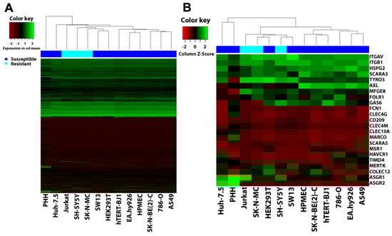 Hierarchical clustering analysis (HCA) does not correlate gene expression to susceptibility to filovirus infection. Microarray data of cell lines tested for susceptibility to filovirus infection as well as primary human hepatocytes (PHH) were clustered based on (A) their global gene expression or (B) gene expression of attachment factors implicated in filovirus entry using the heatmaps.2 of the R library “glplots” package. Transcript probes that yielded no detectable signal were removed prior to analysis. Heatmaps were generated by plotting cell lines as columns and genes as rows using the “complete” method for clustering and “Euclidean” method for distance calculation. In the bar above the heatmaps dark blue represents susceptible cell lines and light blue resistant cell lines.