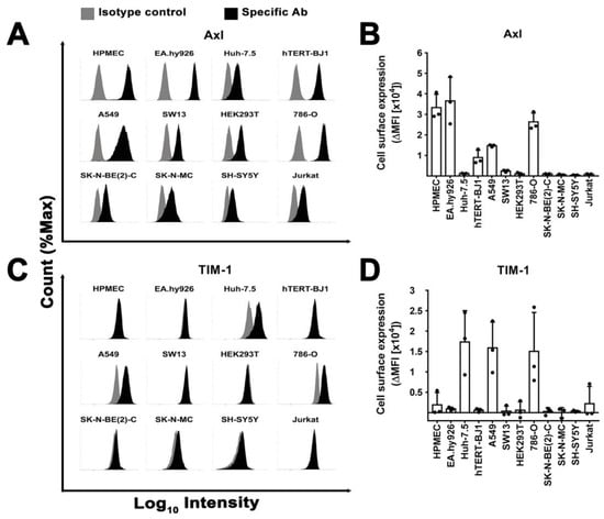 Most cell lines had detectable Axl expression at the cell surface (Figure 7A,B). Among the susceptible cell lines, we observed both high levels (HPMEC or EA.hy926) and low levels (Huh-7.5, HEK293T). Conversely, TIM-1 was expressed only in three susceptible cell lines (Huh-7.5, A549, and 786-O) (Figure 7C,D). Integrins αV and β1 were present in all cells with some susceptible cell lines expressing similar levels to resistant ones (Figure S5A–D). Notably, resistant SH-SY5Y cells lacked or expressed only low levels of all tested plasma membrane proteins.