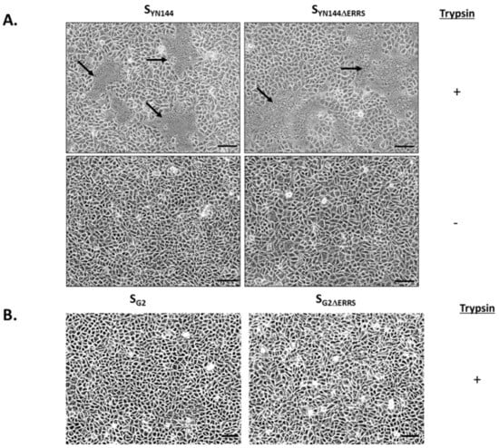 Formation of syncytia in VeroE6 cells stably expressing porcine aminopeptidase N (VeroE6-APN) expressing porcine epidemic diarrhea virus (PEDV) S derived from YN144 and G2. (A) VeroE6-APN cells were transfected with pCAGGS expressing SYN144 with or without the C-terminal motifs (SYN144ΔERRS). Cells were cultured in the presence or absence of trypsin (2 µg/mL). Syncytium formation was evaluated under a light microscope at 24 h post transfection (hpt). Arrows denote syncytium formation. Scale 100 µm. (B) VeroE6-APN cells were transfected with pCAGGS expressing SG2 with or without the C-terminal motifs (SG2ΔERRS). Cells were cultured in the presence of trypsin (2 µg/mL), and the syncytium formation was assessed at 24 hpt. Scale 100 µm.