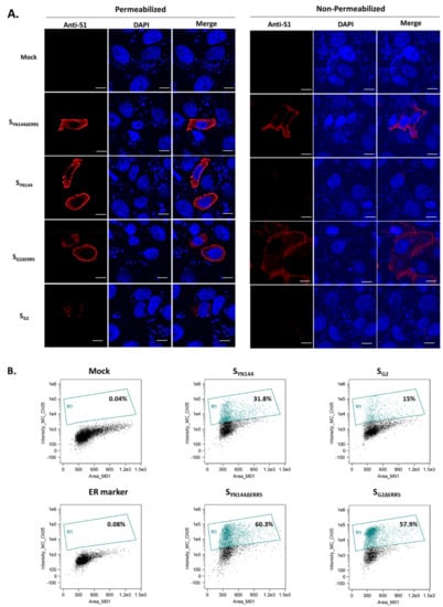 Surface expression of PEDV S lacking the C-terminal motifs. (A) VeroE6-APN cells were transfected with pCAGGS expressing indicated PEDV S. At 24 hpt, cells were subjected to immunofluorescence analysis under permeabilized and non-permeabilized conditions using mouse anti-PEDV S1 and goat anti-mouse IgG Alexa Fluor 647 (IgG H + L) antibodies as primary and secondary antibodies. The glass slips were mounted on slides with DAPI. The samples were analyzed by confocal microscopy. Scale 5 µm. (B) HEK293T cells were transfected with pCAGGS expressing indicated PEDV S. At 24 hpt, cells were detached, fixed, and incubated with mouse anti-PEDV S1 monoclonal antibodies. Cells were subsequently incubated with goat anti-mouse Alexa Fluor 647 (IgG H+L) antibodies and analyzed on a flow cytometer. An anti-calreticulin endoplasmic reticulum (ER) marker was used as a non-permeabilized condition control.