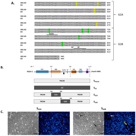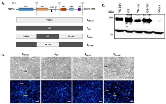 The full-length S of PEDVYN144 (SYN144; GenBank KT021232.1) and PEDVG2 (SG2) were codon optimized for high expression in mammalian cells, synthesized, and cloned in the pUC57 cloning vector (Synbio Technologies, Monmouth Junction, NJ, USA). Of note, the amino acid sequence of SG2 is not yet available in the public database, but it is more than 99% identical to the strain 13JM-291 (GenBank ATJ03623). The synthetic gene was designed to be flanked by MluI and NotI restriction sites to facilitate the cloning into the modified pCAGGS expression plasmid. Removal of the C-terminal intracellular sorting motifs of the pCAGGS-SYN144 and pCAGGS-SG2 was carried out using site-directed mutagenesis by adding double stop codons before Yxxϕ and KxHxx motifs at the cytoplasmic tail. Notably, to facilitate the construction of chimeric S, unique restriction enzyme cutting sites (NheI and SmaI) were designed to swap the fragment spanning residues 440–940 between SYN144 and SG2.