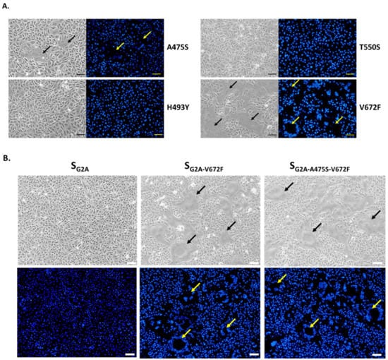 Effect of amino acid substitution in the RBD of SG2 on syncytium formation in VeroE6-APN cells. (A) VeroE6-APN cells were transfected with pCAGGS expressing SG2A with single amino acid substitution at positions 475, 493, 550, and 672 and treated with trypsin. At 24 hpt, cells were assessed for syncytium formation. Scale 50 µm. (B) VeroE6-APN cells were transfected with pCAGGS expressing SG2A, SG2A-V672F, and SG2A-A475S-V672F and cultured in the presence of trypsin. At 24 hpt, cells were evaluated for syncytium formation. Hoechst was used to stain nuclei. Arrows denote the formation of the syncytium. Scale 100 µm. (C) VeroE6-APN cells were transfected with pCAGGS expressing wild-type SG2, SG2-V672F, SG2-A475S, and SG2-A475S-V672F and cultured in the presence of trypsin. At 24 hpt, cells were evaluated for syncytium formation. Hoechst was used to stain nuclei. Arrows denote the formation of the syncytium. Scale 100 µm.