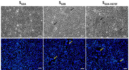 Syncytium formation in VeroE6 cells expressing PEDV S. VeroE6 cells were transfected with pCAGGS expressing SG2A, SG2B, and SG2A-V672F and treated with trypsin. At 24 hpt, cells were assessed for syncytium formation. Hoechst was used to stain nuclei. Arrows denote the formation of the syncytium. Scale 50 µm.