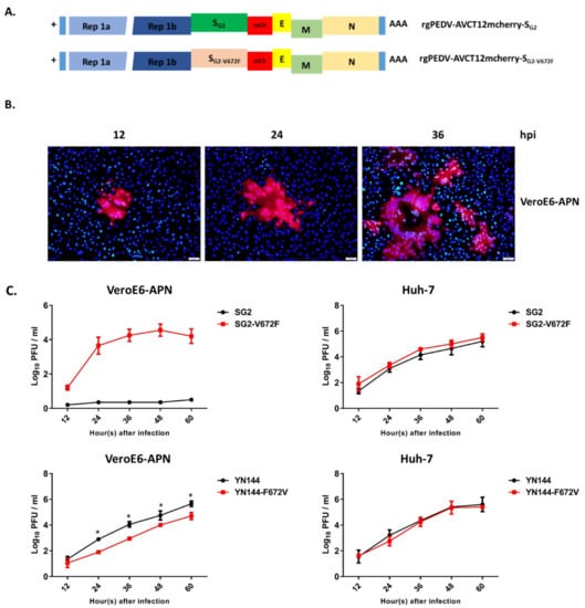 Effect of the V672F substitution on the growth of PEDV in VeroE6-APN cells. (A) Schematic representation of infectious clones used for generation of recombinant PEDV bearing SG2 or SG2-V672F. (B) VeroE6-APN cells were adsorbed with supernatants harvested from HEK293T cells transfected with the infectious clone of rgPEDV-AVCT12mCherry-SG2-V672F. The expression of mCherry was assessed by fluorescence microscopy at indicated times after adsorption. Scale 50 µm. (C) Growth kinetics of recombinant PEDV bearing SG2, SG2-V672F, SYN144, and SYN144 with F672V substitution in VeroE6-APN and Huh-7 cells. Error bars represent mean ± SD. * p < 0.05.