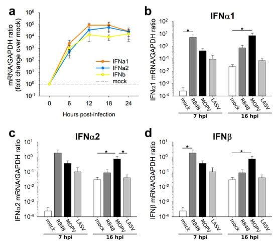 IFN-I production in LASV-infected pDCs is less long-lasting than that of MOPV-infected pDCs. (a) pDCs were infected with MOPV (MOI = 2). Every 6 h, from 0 to 24 hpi, IFN-I mRNA was quantified by RT-qPCR. Data are presented as the fold change in the mRNA/GAPDH ratio in MOPV-infected pDCs relative to uninfected pDCs. (b–d) pDCs were cultured for 7 h or 16 h in culture medium (mock), R848 (1 µg/mL), MOPV, or LASV (MOI = 2). IFNα1 (b), IFNα2 (c) and IFNβ (d) mRNAs were quantified by RT-qPCR. Data shown are the means and SEM of three (a), four (b–d – 7 hpi), or seven (b–d – 16 hpi) independent experiments. ANOVA on Ranks followed by pairwise comparisons (Tukey test) were performed. Differences are significant for p < 0.05. Significant pairwise comparisons are indicated by a star (*).
