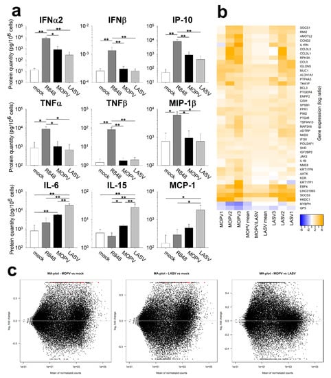 MOPV- and LASV-infected pDCs show different patterns of activation. (a) pDCs were cultured for 16 h with culture medium (mock), R848 (1 µg/mL), MOPV, or LASV (MOI = 2). Protein levels were quantified using the Luminex assay. Data are presented as the means and SEM of five independent experiments. Wilcoxon tests were performed, and differences are significant for p < 0.05 (*) or p < 0.01 (**). (b,c) pDCs were cultured for 12 h in culture medium (mock), MOPV, or LASV (MOI = 1). Cellular mRNA from three independent experiments was quantified by poly-A amplification and next-generation sequencing. (b) Data show the differential expression of genes in MOPV relative to LASV (MOPV/LASV) infected cells or in MOPV or LASV infected cells relative to mock (1, 2, 3, and mean). Genes shown in this figure displayed significant differences of expression (adjusted p < 0.05). (c) MA plots for all pairwise comparison of data sets (MOPV/mock, LASV/mock and MOPV/LASV). Red dots indicate significantly different genes between the two conditions. Triangles correspond to features having a too low/high fold change to be displayed on the plot.