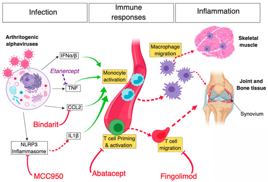 Schematic diagram of key mechanisms of arthritogenic alphavirus-mediated musculoskeletal pathology and novel therapeutic strategies that were shown to limit inflammation and disease. Infection of host mammalian cells by arthritogenic alphaviruses—following a mosquito bite—elicits a potent antiviral cellular response driven by type I IFN, subsequently leading to the production of various proinflammatory cytokines (e.g., CCL2, TNF). In parallel, activation of the NLRP3 inflammasome following alphaviral infection leads to the production of IL-1β, which further contributes to inflammation. Bindarit, a monocyte-chemotactic protein (MPC) inhibitor with CCL2-neutralising properties, was shown to curtail monocyte activation and subsequent macrophage migration to musculoskeletal tissues. Likewise, inhibition of NLRP3 using MCC950 was found to abrogate inflammasome and caspase-driven IL-1β production, in turn, reducing muscle inflammation and bone resorption in CHIKV-infected mice. However, inhibition of TNF using Etanercept (commonly used in the treatment of rheumatoid arthritis) exacerbated alphaviral inflammation of muscle and joint tissue. In addition, alphavirus infection leads to the activation of adaptive immune responses and inhibition of CD4+ T cell priming, or egress from draining lymph nodes in CHIKV-infected mice using Abatacept and Fingolimod, respectively, led to a substantial reduction in cellular infiltration in ankle joints. Red T arrows: inhibitory effect leading to positive disease outcome; Dashed red arrows: direct activation; Solid green arrows: cell stimulatory effect; Solid black arrows: antiviral response products; Purple T arrow: inhibitory effect leading to negative disease outcome. Diagram created using BioRender©.