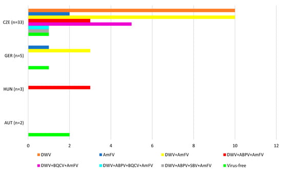 In total, 43 pooled drone semen samples were surveyed for the presence of 11 honeybee viruses. The screening revealed genomes of five viruses, namely DWV, ABPV, BQCV, SBV, and AmFV. Within the detected viral species, DWV and AmFV were discovered as the most prevalent viruses in the analysed samples. Viral infection was detected in 91% (n = 39/43) of samples. Single infection (30% of samples; n = 13/43) as well as multiple infection (61% of samples; n = 26/43) of two, three or four pathogens were also evaluated. The results including pathogen combinations are summarized in Figure 1. Only 9% (n = 4/43) of samples were free of all tested viruses. Detailed description of detected viral pathogens in individual samples and summary of multiple infections are described in Tables S3 and S4.