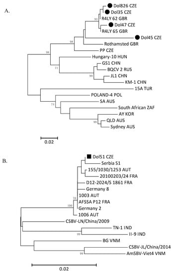 The obtained amplified sequences of BQCV partial helicase gene (between nt positions 2679 and 2961 referring to the complete genome sequence KY243932) were compared to the available BQCV sequences (see Table S2). Phylogenetic analysis revealed high similarity of nucleotide sequence of the described Czech strains, which varied from 91.4% to 99.6%. Constructed phylogenetic tree (Figure 2A) showed that the Czech strains Dol826, Dol35, and Dol47 were closely clustered with the British BQCV strains R4LY62 and R4LY65 (98.6–99.6% of nt similarity). The last Czech strain Dol45 created a separate branch (92.3–92.7% similarity with both British strains). Another available Czech sequence of BQCV (strain PP) showed 90.1–93.6% similarity with our described strains. The most distant BQCV strain 15A from Turkey demonstrated nt similarity rate of 73.4–79.0%. Likewise, to verify SBV detection, the obtained amplicon was sequenced and the occurrence of SBV genome in the drone ejaculate sample 51/17 (2.3%, n = 1/43) was confirmed). This sequence of SBV partial polyprotein gene (nt position 240–668 referring to the complete genome sequence HM237361) was aligned with all partial European sequences of SBV and also with several Asian complete sequences of SBV available in the GenBank (see Table S2). The phylogenetic analysis (Figure 2B) showed very high similarity between all European SBV strains in the analysed partial sequence (99.1–99.8% similarity on nucleotide level).