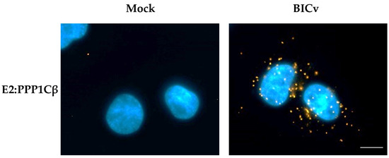 During infection with CSFV, E2 is highly abundant throughout the cell cytoplasm, and consequently, it is hard to easily visualize the potential subcellular co-localization of E2 along with cellular proteins. Proximity ligation assays [33] have the advantage of allowing for the direct identification of transient protein–protein interactions, without the additional background observed in classical co-localization studies. Detection of proteins E2 and PPP1CB were performed using mAb WH303 [32] for detection of E2 and a commercial mAb (Abcam # ab53315) for detection of PPP1CB. Results of the proximity ligation assay confirm that E2 and PPP1CB interact in SK6 cell cultures infected with CSFV, and that this interaction, analyzed at 24 hpi (under similar conditions as those used to perform the co-immunoprecipitation studies), occurs in distinct punctate locations throughout the cell cytoplasm (Figure 2). Therefore, both methodologies (co-immunoprecipitation and proximity ligation assay) confirmed the existence of E2 and PP1 interaction during the CSFV infection of SK6 cell cultures.