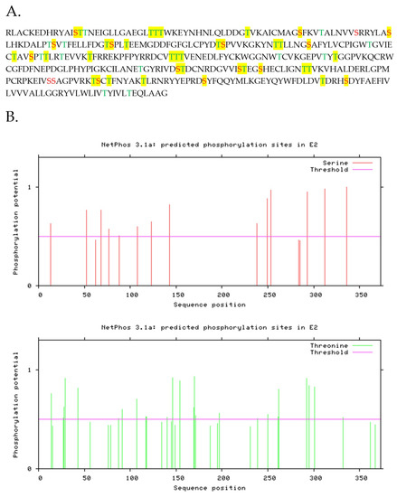 Interaction between CSFV E2 and PP1 may indicate that E2 could be phosphorylated during the virus replication cycle, a fact that has not been previously described. In silico analysis of CSFV E2 using NetPhos 3.1 server [34] was used to predict the presence of potential serine or threonine phosphorylation sites. The server predicted the presence of 13 serine sites (at E2 amino acid positions 13, 52, 68, 77, 88, 108, 123, 143, 238, 249, 293, 312, and 336) and 24 Threonine sites (at E2 amino acid positions 14, 27, 28, 29, 43, 87, 91, 107, 118, 140, 146, 154, 169, 170, 171, 197, 239, 250, 261, 262, 292, 295, 301, and 332) that could be functioning as possible phosphorylation sites (Figure 3A). The predicted sites are highlighted in the amino acid sequence (Figure 3B) and showed that the predicted phosphorylation sites are throughout the coding sequence of E2, increasing the likelihood that E2 is phosphorylated during viral infection.