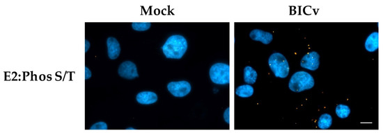 Detection of E2 phosphorylation by PLA. Phosphorylation of E2 was determined with PLA using a pan phosphor-serine/threonine and E2 antibody in SK6 cells either mock infected or with CSFV BICv (MOI = 10). Scale bar is 50 µM.