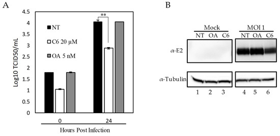 Effect of PPP1CB phosphatase activity on CSFV replication. SK6 cells were pretreated with no drug, PPP1CB phosphatase inhibitor Okadaic Acid (OA), phosphatase activator Ceramide (C6) or no treatment (NT) followed by infection with CSFV (MOI:1) or mock for 2 h. Time points were collected 0 and 24 h post infection (hpi). (A) Viral yields from CSFV infection in SK6 cells treated as indicated. Titers were determined in SK6 cells and expressed as the log 10 TCID 50 /mL, +/−standard error from triplicate samples (OA: Okadaic Acid, C6: Ceramide) ** p Value: <0.01). (B) Whole-cell lysates were collected 24 hpi. Immunoblotting with an E2-specific antibody (band is 55 kDa as expected) showed a decrease in E2 protein concentration with C6 treatment compared to OA and NT (lane 6 vs. 4 and 5). An α-Tubulin-specific antibody was used as a loading control (band is at 50 kDa as expected).