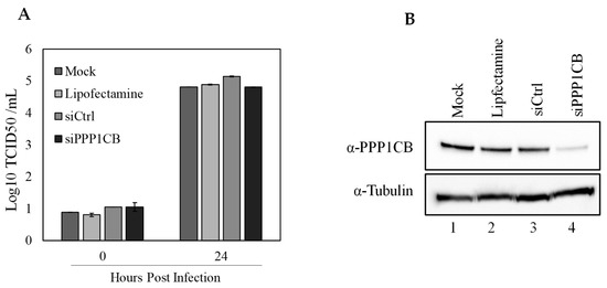 To further understand the role for PPP1CB during CSFV infection, we utilized a specific siRNA that will prevent PPP1CB from being translated and reduce cellular levels of PPP1CB to evaluate if decreasing cellular PPP1CB will have an effect on CSFV replication. SK6 cells were pretreated with siRNA for 24 h and infected with CSFV at an MOI of 0.1. Twenty-four hpi supernatant samples were taken for titration, and cell lysate was assessed by Western blotting to determine the levels of PPP1CB in the cell lysate. It was clear that the specific siRNA had a decrease in PPP1CB when compared to siRNA controls, or untreated cells. However, there was no evident decrease in viral titers between the treatments, suggesting that cells with a reduced level of PPP1CB did not have an effect on virus replication (Figure 6).