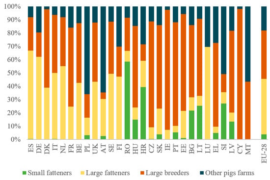 | EU Member States | Type of Pig Farm (%) | Total Number of Pig Farms by Countries | Total Number of Pigs (2018) | |||