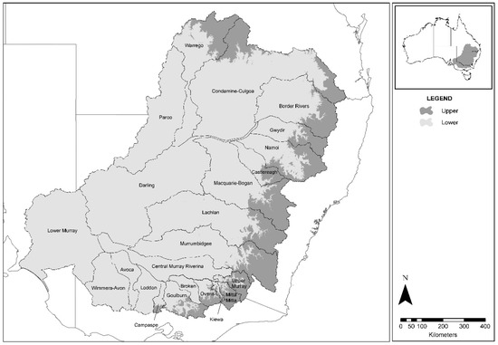 Maximum extent of study area and catchments of the Murray–Darling Basin.