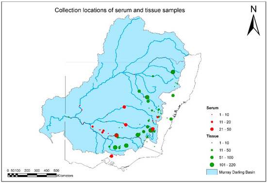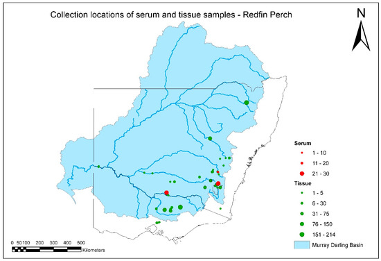 Fish samples provided for laboratory testing were collected during established research programs by collaborating government agencies. In NSW, the Department of Primary Industries (NSW DPI) collected samples under the MDB Authority Sustainable Rivers Audit (SRA) (Figure 1) [31]. These samples were categorized according to fish species, collection year, river catchment, and altitudinal zone. In each zone, 7 fish sampling sites were chosen using a stratified random procedure, with a minimum of 18 sites per river catchment. Each was the centerpoint of a one-kilometer stream reach. This design was adopted following power and benefit–cost analyses of species-accretion data from the SRA [32]. Fish were sampled by boat-mounted or backpack electrofishing using standardized effort and methods. Sampled catchments in 2008 were Border Rivers, Broken, Darling, Loddon, Lower Murray, Mitta, Murray-Riverina, and Upper Murray. Sampled catchments in 2009 were Avoca, Goulburn, Kiewa, Lachlan, Macquarie-Bogan, Namoi, Paroo, and Warrego. Sampled catchments in 2010 were Campaspe, Castlereagh, Condamine-Culgoa, Gwydir, Murrumbidgee, Ovens, and Wimera-Avon. Other samples in NSW were collected from major impoundments that received an annual stocking of native fish and trout from several other independent research projects, and from disease investigations following notification of mortality events.