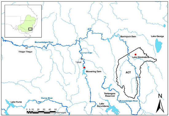 Epizootic haematopoietic necrosis virus (EHNV) is an aquatic pathogen that has been of international concern since its emergence in the early 1980s and is listed by the World Organization for Animal Health [1]. Infection with EHNV is systemic and causes epizootic hematopoietic necrosis (EHN), a disease characterized by extensive visceral tissue damage leading to mortality [2,3]. The first epidemics caused by EHNV occurred in freshwater impoundments in central Victoria (VIC), including Lake Mokoan and Nillahcootie in the Broken River catchment. Several populations of wild redfin perch (Perca fluviatilis) were impacted in the period from 1984 to 1986 [4,5]. These first epidemics often resulted in the mortality of tens of thousands of juvenile redfin perch and, in some outbreaks, adult fish were also affected. From 1986 to the mid-1990s, outbreaks of EHN in redfin perch and farmed rainbow trout (Oncorhynchus mykiss) were reported across the Murray–Darling Basin (MDB) in southeastern Australia [6].