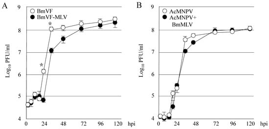 To investigate whether persistent infection with BmLV affects BmNPV proliferation, BmLV-negative BmVF or -positive BmVF-MLV cells were inoculated with BmNPV. As shown in Figure 1A, it was observed that the BmNPV proliferation in BmVF-MLV cells was less than that in BmVF cells at 24 and 36 hpi. The multiplication of BmNPV plateaued at 36 and 72 hpi in BmVF and BmVF-MLV cells, respectively. Next, to investigate the effects of the inoculation with BmLV on NPV multiplication, S. frugiperda-derived Sf9 was inoculated with both AcMNPV and BmLV or AcMNPV alone. As shown in Figure 1B, co-inoculation with BmLV in Sf9 slightly delayed the growth of AcMNPV at 36 and 48 hpi. We have reported that Sf9 are not permissive to BmLV persistent infection but approximately 60% of virus RNA remained at 7 days postinfection compared to just after inoculation []. These results indicated that persistent infection or co-inoculation with BmLV is involved in the multiplications of these NPVs. Host gene expression is either up- or down-regulated by infection with BmNPV or BmLV [,,]. The host cell environment, changed upon BmLV infection, may have affected BmNPV proliferation. Additionally, we reported previously that both siRNA and piRNA pathways in B. mori-derived cells are responsible for suppressing BmLV proliferation []. Therefore, activation of these pathways, caused by BmLV infection, may delay the multiplication of these NPVs. Interestingly, the interaction between the persistently infective virus Aedes albopictus densovirus (AalDNV) and lethally infectious Dengue virus serotype 2 (DEN-2) in A. albopictus-derived C6/36 cells illustrated that AalDNV infection significantly decreased DEN-2 proliferation []. Regulation of host gene expression and/or activation of host defense by AalDNV persistent infection may have reduced DEN-2 proliferation.