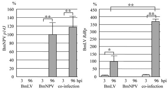 BmLV propagation in B. mori larvae is enhanced by co-infection with BmNPV. On Day 1, fifth instar larvae were injected with BmLV, BmNPV, or co-injected with both. At 3 (open column) and 96 hpi (closed column), RNA was extracted and subjected to reverse transcription-quantitative polymerase chain reaction (RT-qPCR) using primers for BmLV RdRp and BmNPV p143 (mean + s.d., n = 3, * p < 0.05, ** p < 0.01).