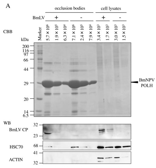 3.3. BmLV Infectious Virions are Incorporated into OBs of BmNPV