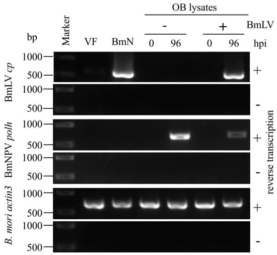 Jakubowska et al. have reported a close relationship between SeMNPV and another small RNA virus, SeIV1, replicating in the same host []. The SeMNPV OB incorporates SeIV1 virions, and co-infection with SeMNPV and SeIV1 results in reduction of both host body weight and SeMNPV OB production [,]. To investigate whether BmNPV OBs incorporate BmLV particles, BmNPV OBs from BmLV-positive and -negative cells were subjected to Western blot analysis using BmLV CP antiserum. As shown in Figure 3A, while there was no detectable signal from the OBs prepared from B. mori larvae, BmLV CP signals were observed in the OBs prepared from BmN4 cells. While the signal intensity of HSC70 (a structural protein of ODV detected from OBs) is weaker than that from cultured cells, CP signal intensity detected in 5.7 × 106 OBs was comparable to that in 3.4 × 103 BmLV-positive cells (Figure 3A). In addition, while several CP signals were observed in BmLV-positive cultured cell lysates, one specific CP signal was detected from BmLV-positive OBs. Our previous study showed that several CP signals were observed in BmLV-infected cell lines, and one specific CP signal was detected from the culture medium containing infectious BmLV particles released from BmLV-infected BmVF cells []. These results suggested that this CP signal detected from OBs from BmLV-positive cells was derived from mature BmLV particles embedded into BmNPV OBs. Next, to exclude the possibility that the CP signal detected from OBs was due to the attachment of BmLV virions to the OB surface, 3 × 108 OBs with no CP signal detected were incubated with a conditioned medium prepared from 4 × 105 BmN4 cells, including an abundant amount of mature BmLV. As shown in Figure 3B, no CP signal was observed in either 2.7 × 106 or 2.0 × 106 OBs incubated with BmLV, while a clear CP signal was detected from the conditioned medium of 9.0 × 103 BmN4 cells. Also, to detect the BmLV particles embedded in OBs, the OBs from BmLV-positive and -negative cells were observed using transmission electron microscopy. Interestingly, although it is unclear whether it is BmLV, some ambiguous particles were observed in OBs from BmLV-positive cells but not in those from BmLV-negative cells (Supplementary Figure S1). These results suggested that BmLV virions are incorporated into the inside of BmNPV OB. Next, to clarify whether BmLV particles incorporated into OBs were infectious, BmLV-positive and -negative OBs were dissolved in an alkaline solution; then, these OB lysates were inoculated into BmLV-negative BmVF cells. As shown in Figure 4, at 96 hpi, while no amplified product of cp was detected in BmVF cells inoculated with the lysate of BmLV-negative OBs, a clear cp band was observed in that of BmLV-positive ones. As a control, we examined the expression of BmNPV polh in infected cells. Although ODVs are much less infectious to cells compared to BVs [], the amplified products of polh were detected from BmVF cells inoculated with either BmLV-positive or -negative OB lysates (Figure 4). These results indicated that small numbers of BmLV infectious virions were incorporated in BmNPV OBs.