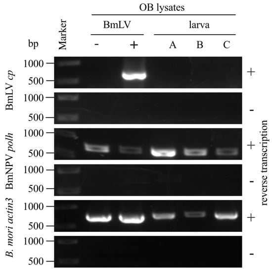 Infection study of the OB lysates collected from B. mori larvae co-infected with BmNPV and BmLV. On Day 1, fourth instar larvae were orally infected with BmLV-positive OBs. At 96 hpi, OBs were extracted from the hemolymph of three larvae (A–C) and dissolved in an alkaline solution. The OB lysates were inoculated onto BmVF cells. At 96 hpi, RNA was extracted and subjected to RT-PCR using primers for BmLV cp, BmNPV polh, and B. mori actin3. BmLV-negative and -positive OB lysates were used as controls. Size markers are indicated on the left side of the panel.