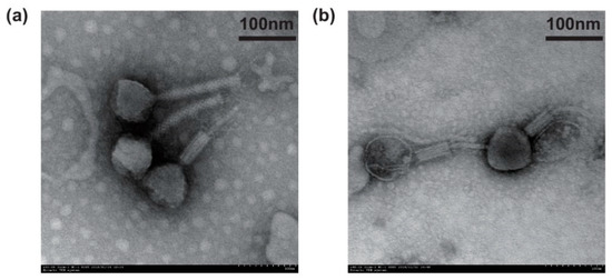 Transmission electron microscopy images of phages (a) vB_PaeM_SCUT-S1 and (b) vB_ PaeM_SCUT-S2 negatively stained by 2% phosphotungstic acid.