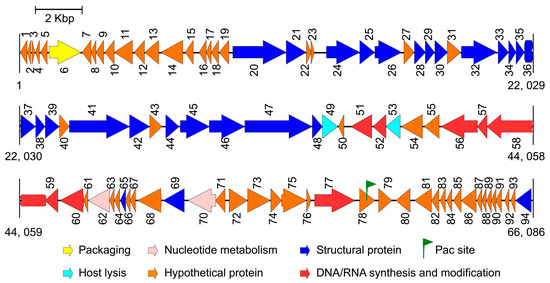Genome map of phage vB_PaeM_SCUT-S1. The arrows indicate the predicted open reading frames, and the different colors indicate the diverse functions of the coded proteins.