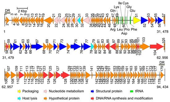 Genome map of phage vB_PaeM_SCUT-S2. The arrows indicate the predicted open reading frames, and the different colors indicate the diverse functions of the coded proteins. DR: direct repeat.