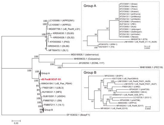 Maximum likelihood tree showing the phylogenetic relationships among phages of genus Pbunavirus. The whole genome sequences were aligned by MAFFT [37], and the tree was visualized by MEGA 7 [40]. The value at the nodes indicated the bootstrap support scores as calculated using 1000 replicates. Phage vB_PaeM_SCUT-S1 was colored red.