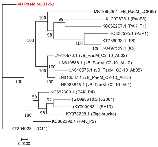 Maximum likelihood tree showing the phylogenetic relationships among phages of genus Pakpunavirus. The whole genome sequences were aligned by MAFFT [37] and the tree was visualized by MEGA 7 [40]. The value at the nodes indicated the bootstrap support scores as calculated using 1000 replicates. Phage vB_PaeM_SCUT-S2 was colored red.