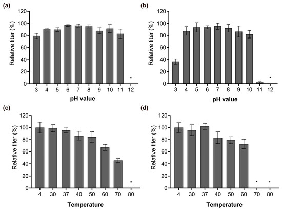 Relative amount of infectious phage particles after different treatments. (a) vB_PaeM_SCUT-S1 and (b) vB_PaeM_SCUT-S2 incubated for 1 h at different pH levels; (c) vB_PaeM_SCUT-S1 and (d) vB_PaeM_SCUT-S2 incubated for 1 h at different temperatures. * No plaques were detected at pH 12 for either Phages S1 and S2 (a,b), at 80 °C for Phage S1 (c) and at 70 °C or 80 °C for Phage S2 (d), indicating that the phages were completely inactive in these conditions. Three independent experiments were performed.